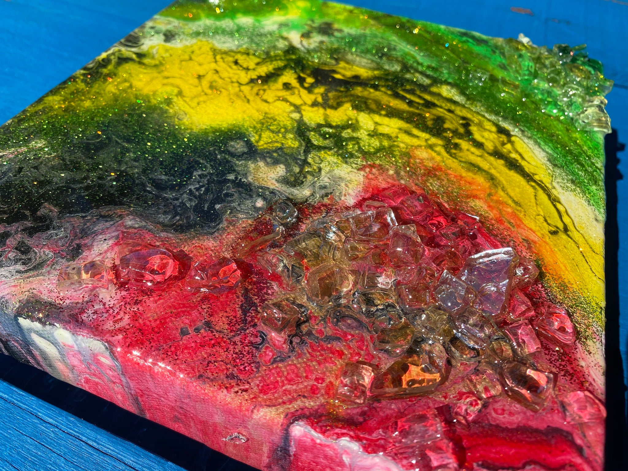 Original artwork from the Mermaid Bungalow's GreenPapayaPalace bikini line collection. 8 x 8 poured resin artwork by artist Rochelle Irons. This piece consists of red, yellow, black and green poured resin fluid art and crushed recycled glass on a stretched canvas.